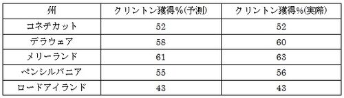 前回の記事に書いた民主党予備選モデルで予測されていた5州の予備選の結果がでましたので追記しておきます。 ニューヨークタイムズによりますと、モデルの予想通りヒラリー・クリントンがロードアイランド州以外の4州で勝利し、各州での彼女の得票率は以下の…